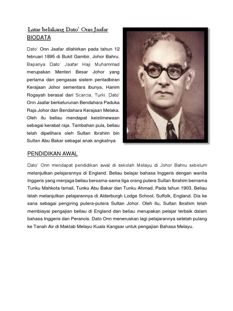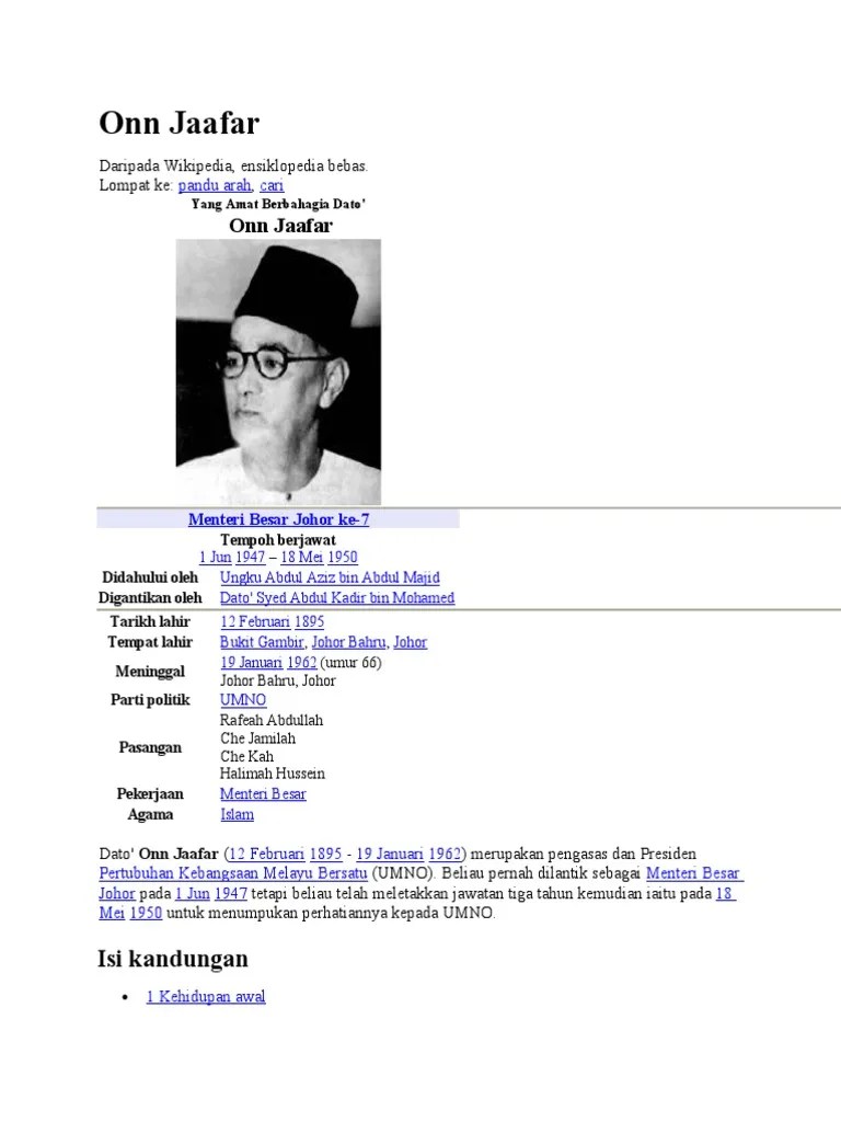 Penubuhan umno diisytiharkan dan dato onn jaafar, menteri sumbangan dato onn jaafar. Oct 25, 2020 · orang melayu telah bantah malayan union di bawah pimpinan dato' onn bin jaafar secara tegas.
